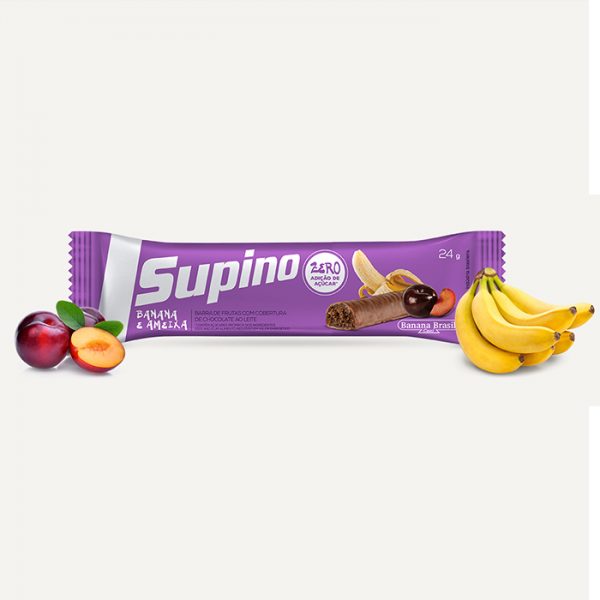 O Supino Banana Ameixa é uma barrinha de frutas desidratadas da marca Banana Brasil, feita com banana-passa, ameixa desidratada e cobertura de chocolate zero açúcar. É rica em fibras, sem glúten, sem conservantes e com baixo teor calórico (cerca de 78 kcal por unidade de 24g).